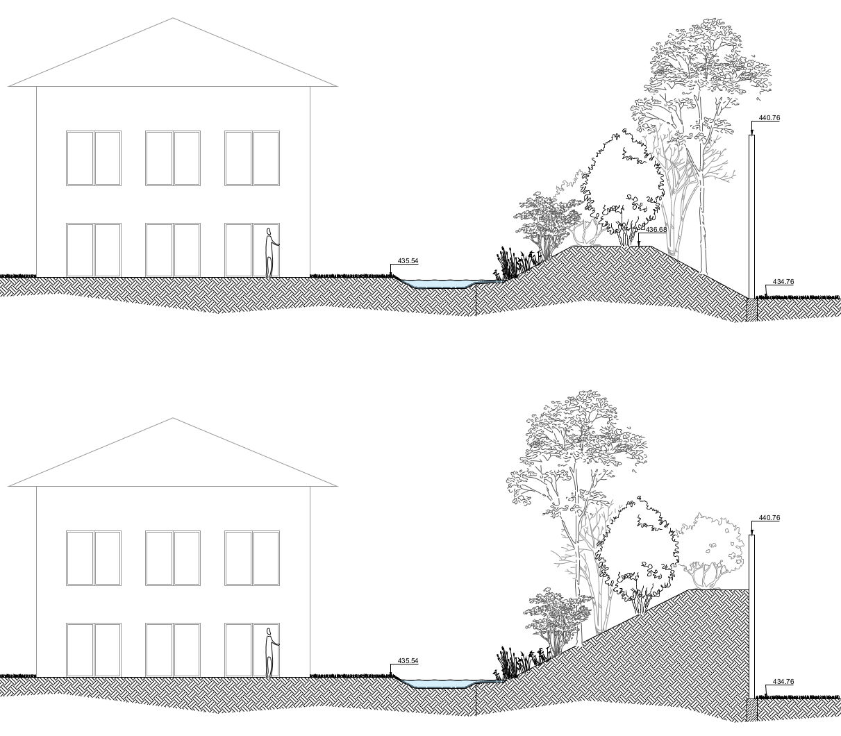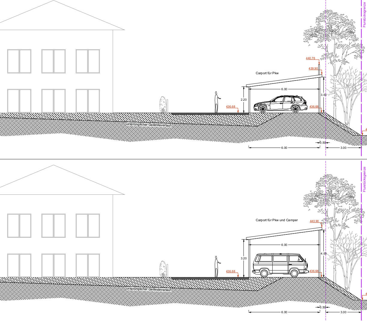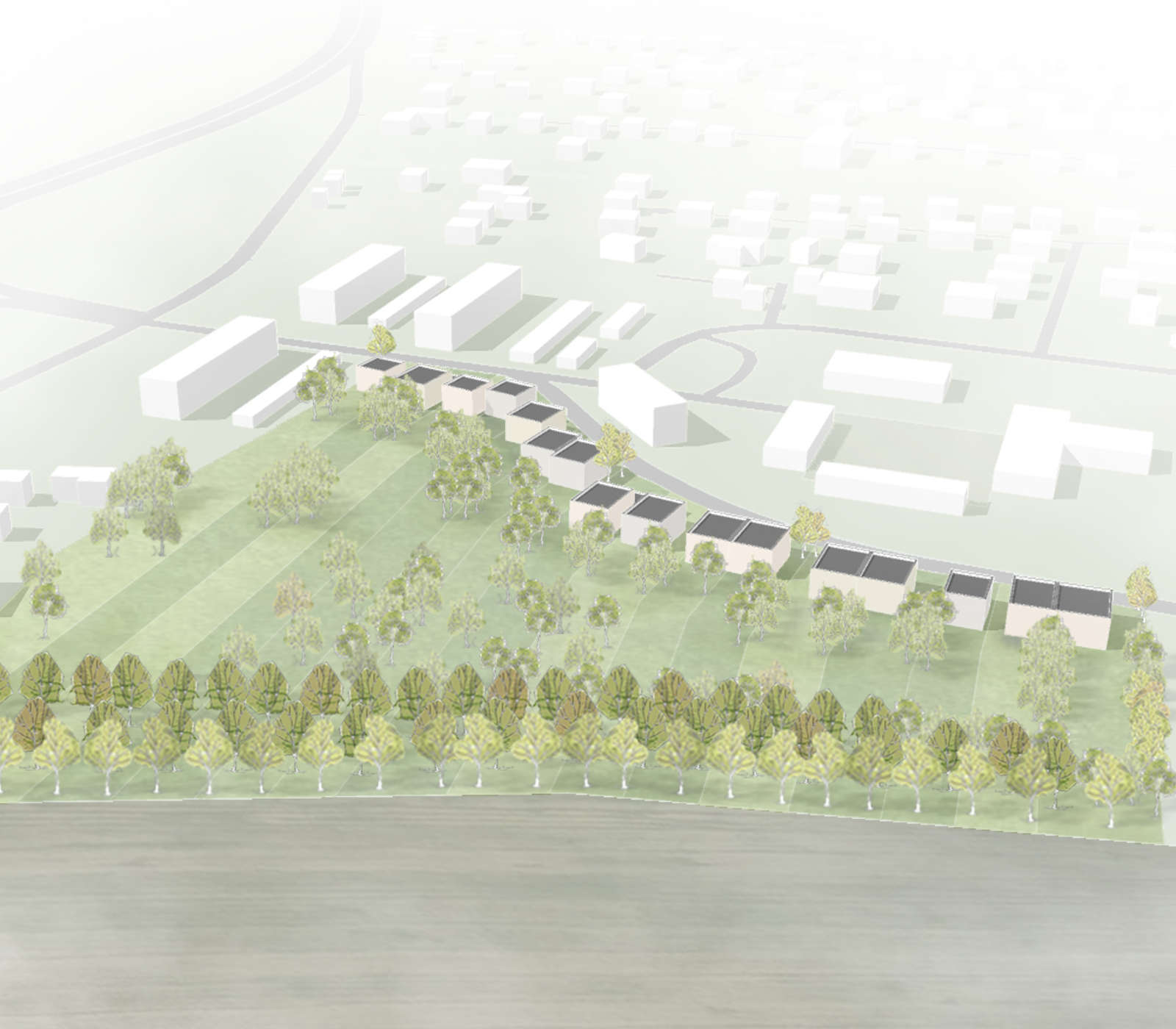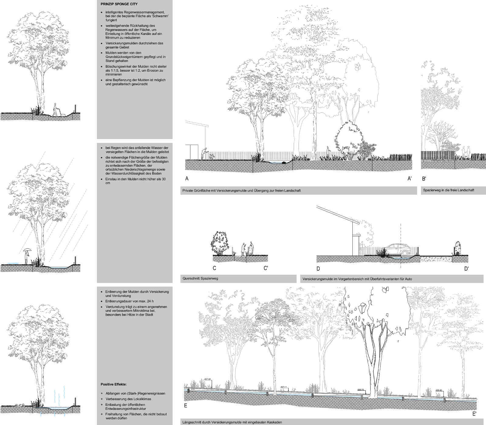 Die im Rahmen einer Ersatzpflanzung zu erbringenden 150 neuen Bäume wurden in die Planung integriert, um die raumbildenden Wirkungen der Pflanzung optimal zur Unterstützung des Gestaltungskonzeptes zu nutzen. Eine Herausforderung stellte der von der benachbarten Hundeschule ausgehende Lärm dar. Diesem wird zukünftig mit einer Schallschutzwand als integraler Bestandteil einer Carportanlage begegnet.
