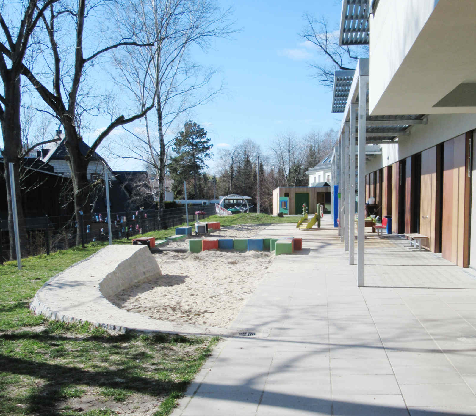Die Zufahrt zur Kita erfolgt über einen Parkweg der denkmalgeschützten Parkanlage. Bei der Planung der erforderlichen Freianlagen für die KiTa und der Einordnung notwendiger Stellplätze musste der vorhandene Altbaumbestand beachtet und unbedingt erhalten werden. Die unmittelbare Nachbarschaft zu Kleingärten und verschiedenen Wohngrundstücken stellte bei der Gestaltung der Freianlagen eine zusätzliche Herausforderung dar.