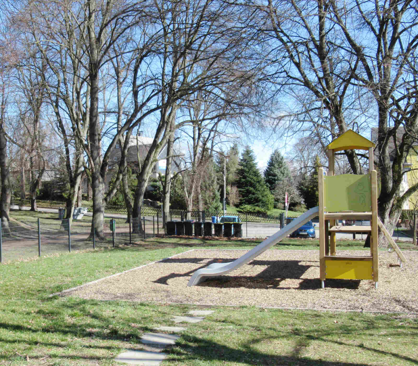 Auf der südlichen Böschung des Geländes wurden umfangreiche Strauchbepflanzungen angelegt. Das Gelände der Kita wurde neu umzäunt.